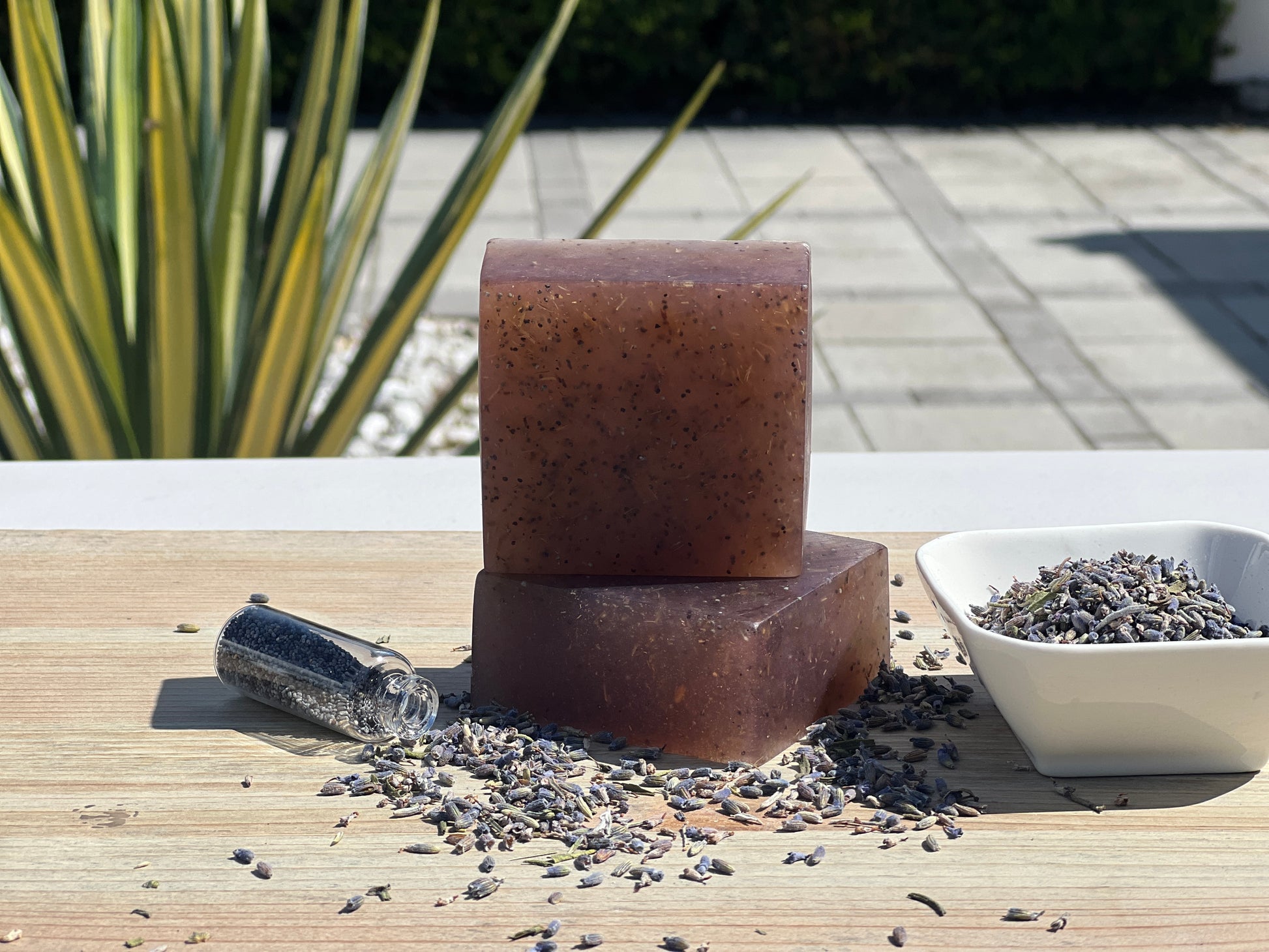 Ingredients: Sorbitol, Propylene Glycol, Sodium Laureth Sulfate, Stearic Acid, Water, Sodium Hydroxide, Myristic Acid, Sodium Cocoyl Isethionate, Glycerin, Poppy Seeds, Pure Vitamin E, Organic Coconut Oil, Organic Jojoba Oil, Ground Organic Lavender Flowers, Essential Oil, Mineral Pigment.