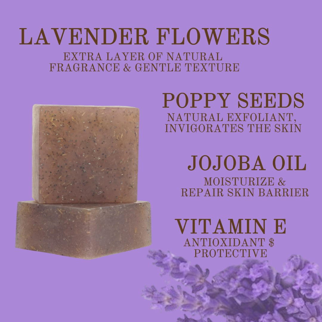 Escape into a moment of tranquility with our Lavender soap, a beautifully crafted bar designed to cleanse and soothe both body and mind. This premium, crystal-clear soap base, enriched with a blend of nourishing oils, provides a gentle and luxurious lather. Finely ground lavender flowers and poppy seeds oer a light, natural exfoliation, while the calming essence of lavender fills the air, leaving your skin feeling balanced, soft, and serenely fragrant.